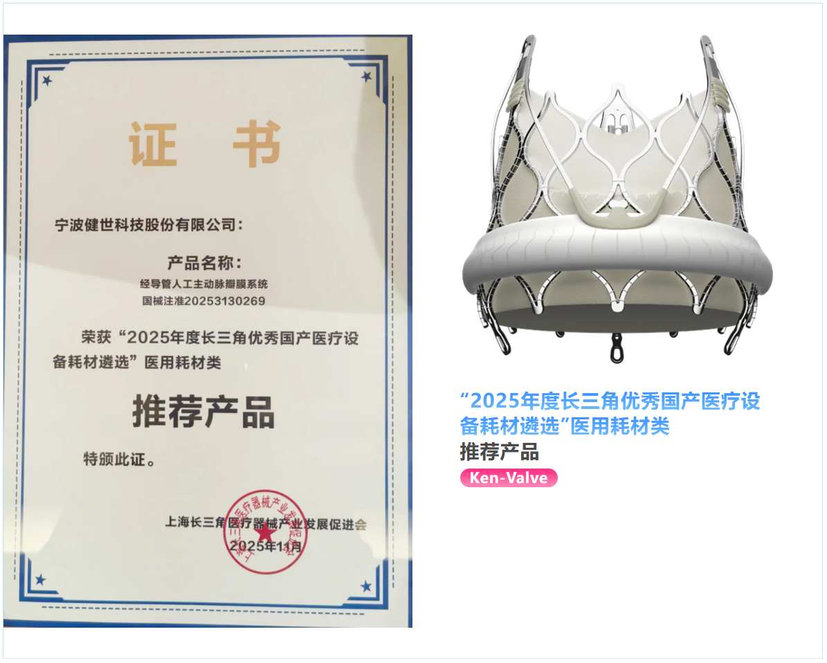 智通财经APP获悉,近期,健世科技(09877)经导管人工主动脉瓣膜系统荣获“2025年度长三角优秀国产医疗设备耗材遴选”医用耗材类推荐产品。