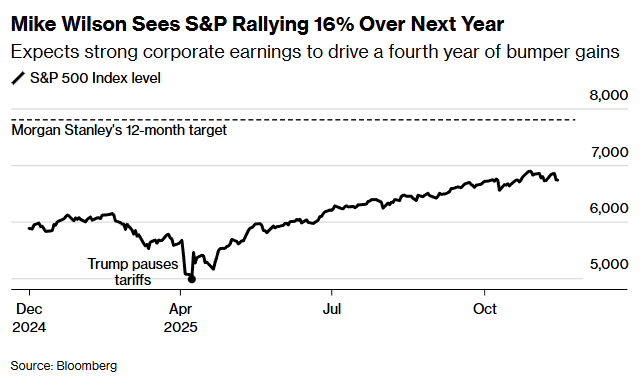 Michael Wilson在一份报告中表示:“我们正处于一轮新的牛市和盈利周期之中,尤其是对指数中许多此前落后的板块而言。”该策略师预计,标普500指数成分股公司的每股收益未来两年将分别增长17%和12%。他提到,企业更强的定价能力、人工智能带来的效率提升、宽松的税收与监管政策以及稳定的利率都是支撑因素。