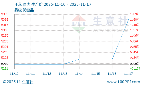 据生意社商品行情分析系统显示,2025年11月10日至11月17日甲苯市场震荡上行。11月10日甲苯基准价在5240元/吨,11月17日甲苯基准价在5330元/吨,涨1.72%。本周期国内甲苯市场震荡上涨。原油走高带动现货市场心态好转,主营炼厂出厂价格普遍上调,下游化工及调油行业按需采购。华东及华南市场价格小幅上调,市场商谈气氛尚可,综合来看甲苯市场本周稳中偏强运行为主。