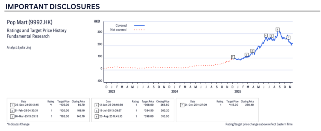 花旗给予泡泡玛特415.00港元的目标价,基于28倍的2026年预期市盈率。报告认为,鉴于公司不断改善的增长前景和执行力,其理应获得高于4年历史平均P/E 10%的溢价。虽然其估值高于全球同行,但花旗认为这是合理的,因为泡泡玛特的海外扩张带来了更快的增长速度。