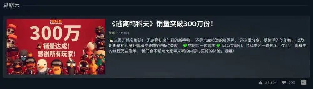 接着 10 月,B 站自研游戏《逃离鸭科夫》成为今年国产单机领域的最大黑马。玩家口碑方面,《黑神话:悟空》珠玉在前,《逃离鸭科夫》仍在 Steam 近 3.3 万条评测中保持 96% 的好评率,在线用户峰值突破 30 万,成功跻身国产单机历史第二;销售业绩方面,该游戏上线两周销量突破 300 万份,销售额超 2 亿元。