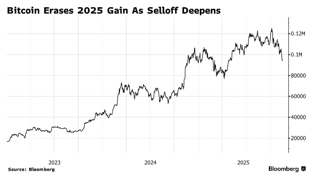 这款主导市场的加密货币周日跌破93714美元,价格已低于去年末特朗普胜选带动金融市场狂欢时的收盘水平。比特币曾在10月6日飙升至126251美元的历史峰值,但四天后特朗普出人意料的关税言论引发全球市场震荡,比特币随之开启跌势。