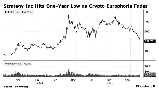 数字资产领域最显著的“买方罢工”案例之一来自迈克尔・塞勒旗下的Strategy(MSTR.US)——这家从软件企业转型比特币巨鲸的上市公司曾是企业财团配置加密货币资产的典范,但如今其股价已接近其比特币储备的估值水平,这一迹象表明,投资者不再愿意为塞勒高杠杆信念模式支付溢价。