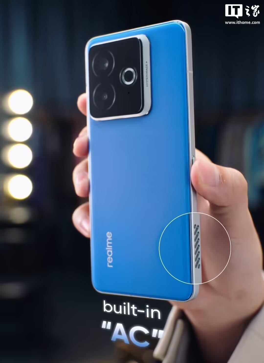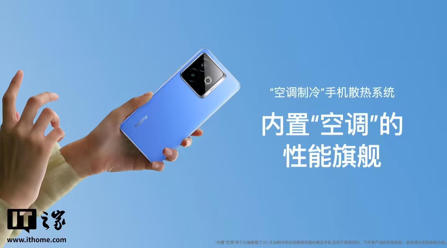 结合IT之家此前报道,realme 真我曾在今年 8 月亮相了一台内置“空调”的性能旗舰,搭载 7700mm² 超大单体 VC,配备 TEC 制冷元件、全新固态制冷方式,开启风扇时温度可降 6°C。