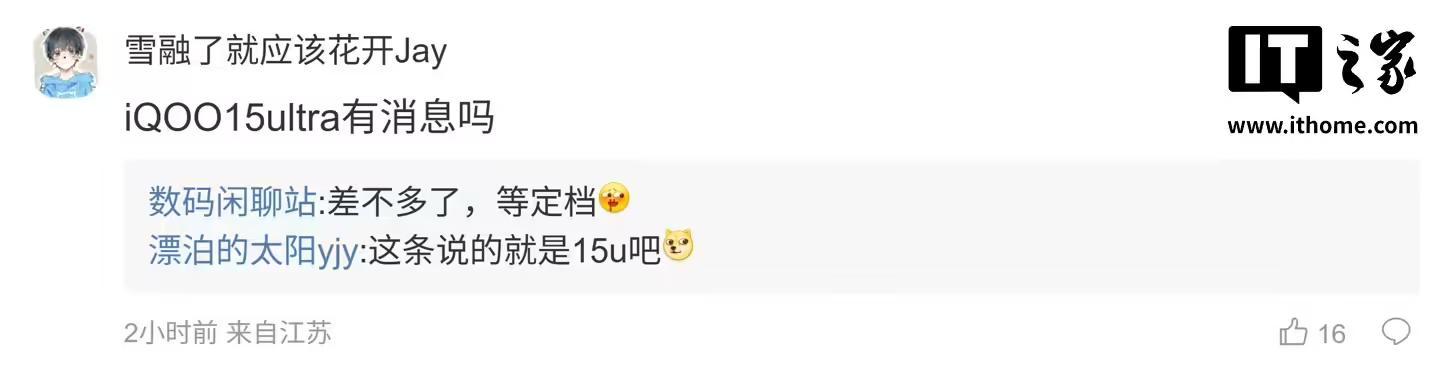 后续有用户在评论区表示:“不喜欢!!好端端的又多一个占用空间的零件。。。搞毛啊?”,博主回复道:“风扇可能是接下来的行业方向,明年进入 2nm 制程后,芯片工艺很难再有大突破,要想办法整活儿”;另一名用户则询问道:“iQOO15ultra 有消息吗”,博主回复道:“差不多了,等定档”。