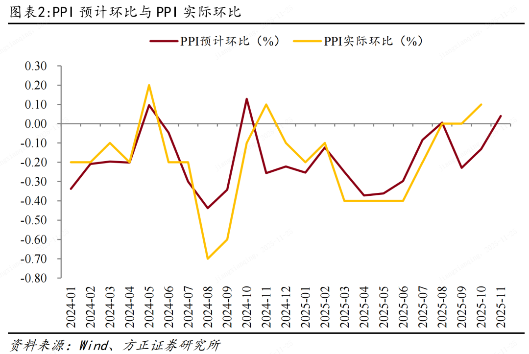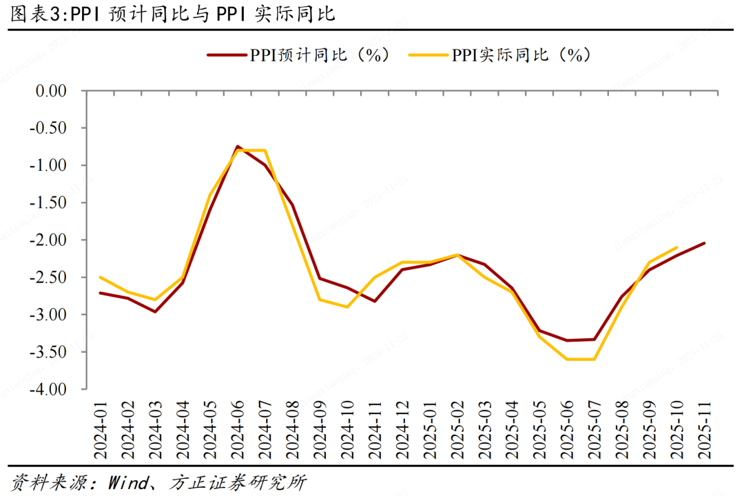 基于上述流通领域生产资料价格变动情况,我们预测11月PPI环比+0.04%(前值+0.1%)(图表2);预计11月PPI同比降幅为-2.0%,同比降幅较前值-2.1%小幅收窄(图表3)。