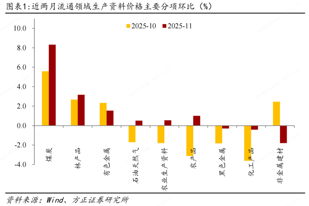 根据国家统计局发布的2025年11月中旬流通领域生产资料价格变动情况,2025年11月流通领域生产资料价格环比上涨(+1.4%,前值+0.1%),各分项表现如下(图表1):
