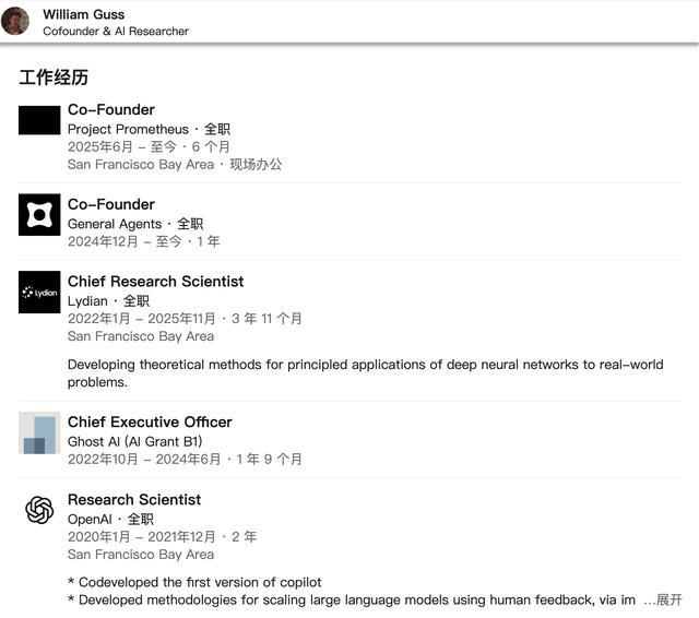 值得一提的是,General Agents的联合创始人、前OpenAI研究科学家威廉·格斯(William Guss)的领英资料显示,他在Project Prometheus中的身份是联合创始人兼AI研究员。
