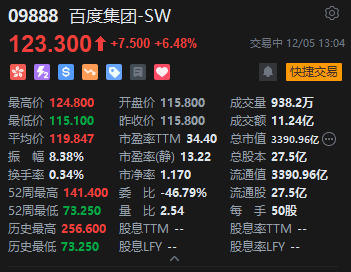 百度港股午后拉升涨超7%,报价124.8港元,现成交额超11亿港元