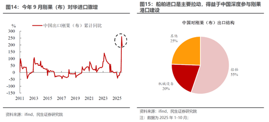 利比里亚:依靠船舶注册便利化催生特殊增长模式。利比里亚虽经济体量较小,却凭借全球主要方便旗船籍国地位,通过船舶注册便利化政策吸引国际船东集聚,形成“中国造船-利比里亚注册”的闭环。1-10月,利比里亚对华进口同比激增50%,其中船舶进口就拉动了约40个百分点的增速。
