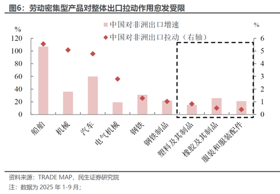 相较机电产品的高增长,劳动密集型产品对整体出口拉动作用愈发有限。塑料橡胶、家具、纺织服装及鞋类等劳动密集型产品虽仍有一定份额,但因中国低端产业转移、本地产业保护及东盟等地区的竞争,在非洲自华进口中占比整体下行、增速放缓,对整体出口增长的拉动作用较弱。