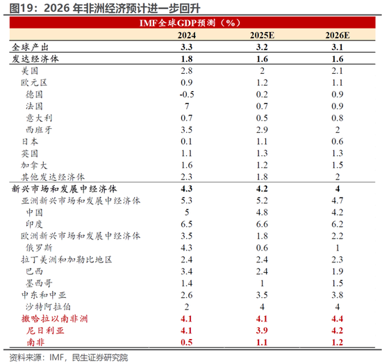 非洲经济温和复苏,贸易增长基础稳固。根据IMF预测,2026年撒哈拉以南非洲GDP增速由4.1%进一步回升至4.4%,经济需求依然强劲,叠加中国在非洲市场的加快布局,中非贸易有望继续得到支撑。