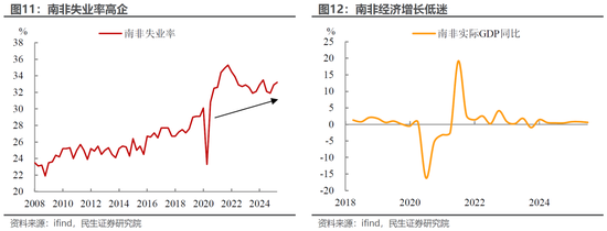 除此之外,埃及、阿尔及利亚及南非增速相对偏缓,尤以南非为甚——1-10月对华进口仅增长5%,成为非洲对华贸易中的“差等生”。在电力短缺和能源供应的不稳定、债务规模攀升以及高失业率等因素共同推动下,南非国内经济面临严重困境。叠加今年以来美国加征关税对其汽车、农产品出口的扰动,经济增长动能被严重侵蚀,对中国商品的拉动作用显著受限。