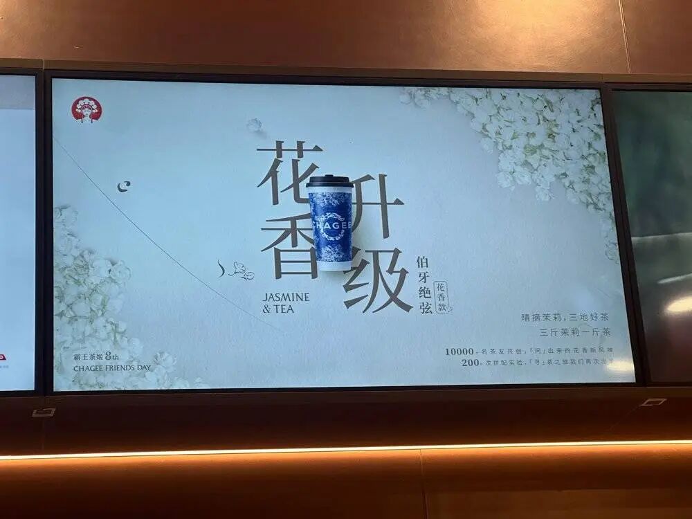 图为霸王茶姬新品“伯牙绝弦”花香款电子屏展示