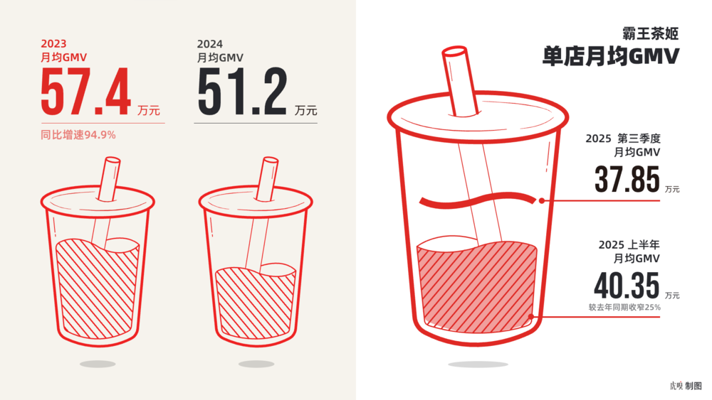 虎嗅获悉,2023年霸王茶姬的单店月均GMV为57.4万元,同比增速为94.9%。到2024年,霸王茶姬的单店月均GMV为51.2万元。2025年上半年,门店单店平均GMV为40.35万元,较去年同期的53.8万元收窄25%。到第三季度,单店月均GMV为37.85万元。