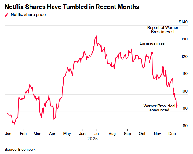 奈飞股价在12月2日至10日期间累计下跌了15%,创下自2022年5月以来最差的六连跌纪录。该股股价在过去两个月累计下跌23%,市场对其收入增长前景的担忧,因其收购华纳兄弟探索的风险而加剧。派拉蒙天舞(PSKY.US)对华纳兄弟探索发出的1080亿美元敌意收购要约,以及美国总统特朗普对奈飞计划收购华纳兄弟探索一事提出了潜在的反垄断方面的担忧,都进一步加剧了市场的不安,引发了可能爆发竞购战和遭遇监管机构潜在反对的阴影。