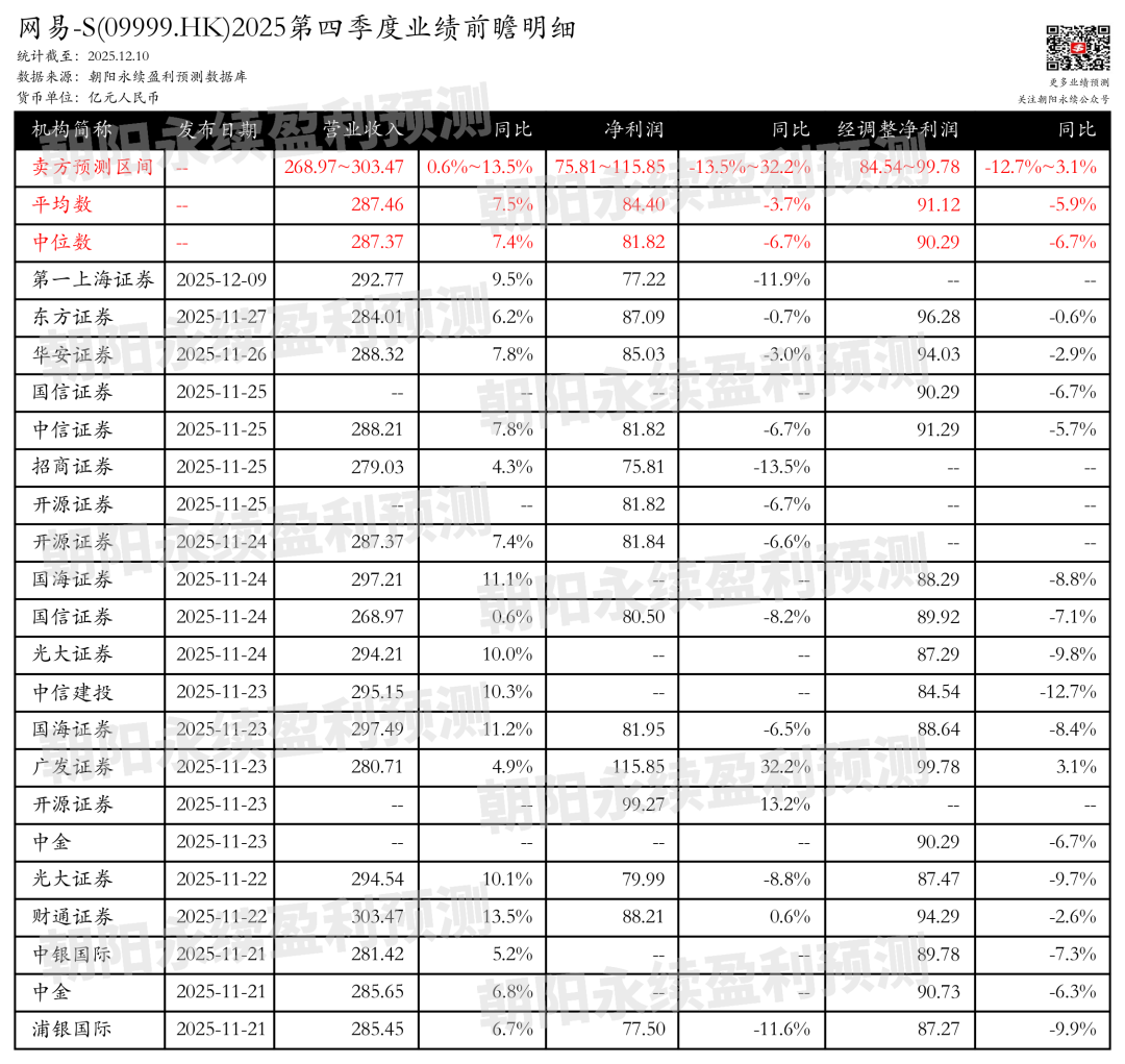 网易-S:AI赋能教育音乐,预测Q4一致预期营收268.97~303.47亿元,同比0.6%~13.5%