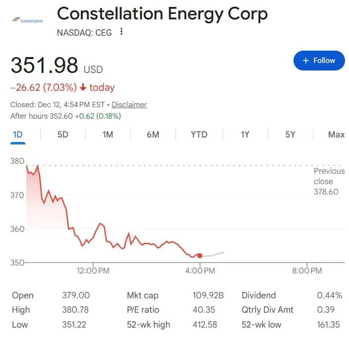 抛售潮甚至蔓延至能源板块,Constellation Energy、Vistra、GE Vernova和Cummins等电力相关股票均跌。核电巨头Constellation收跌7%。