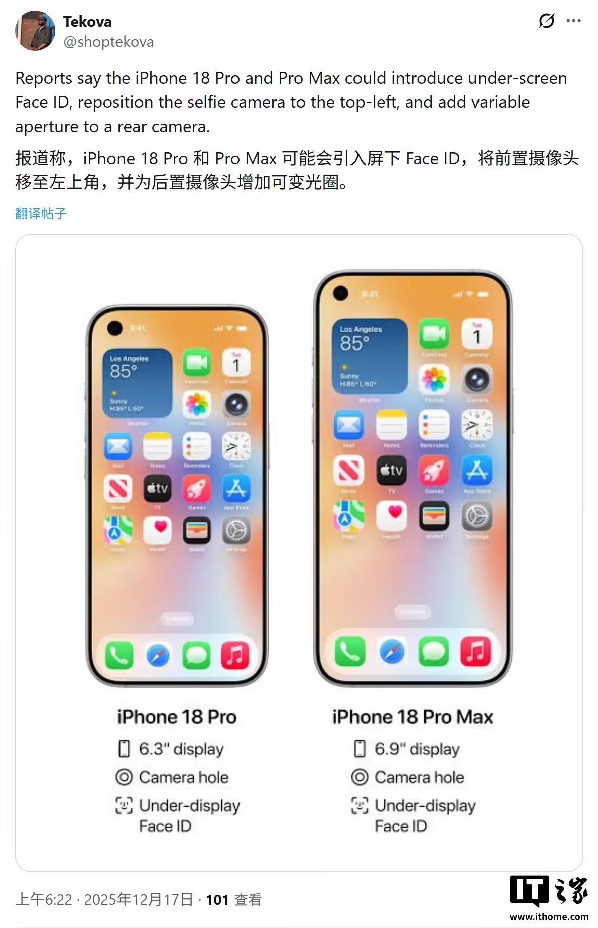 IT之家 12 月 17 日消息,科技媒体 The Information 昨日(12 月 16 日)发布博文,爆料称苹果 iPhone 18 Pro 和 iPhone 18 Pro Max 将迎来重大外观变革,计划彻底摒弃“灵动岛”药丸形挖孔,转而采用左上角单打孔前置镜头与屏下 Face ID 技术。