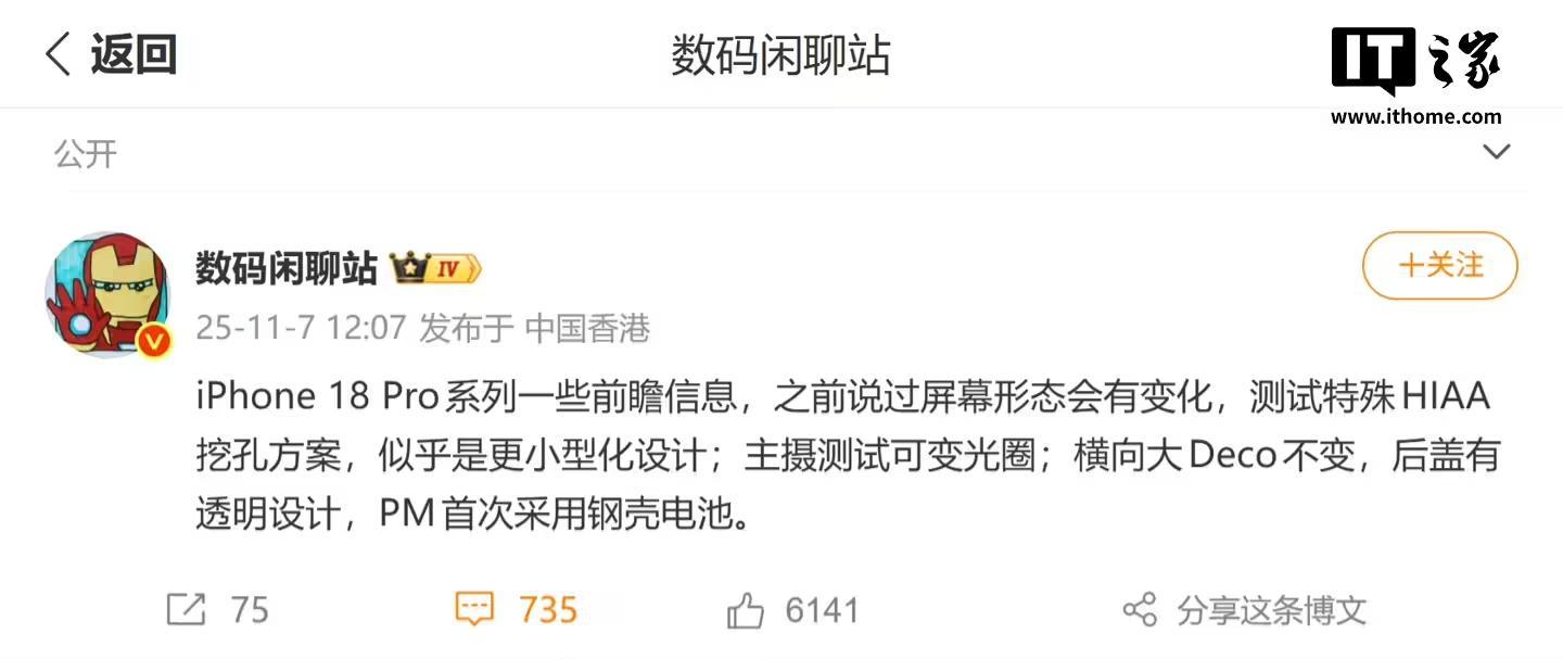 该信息和 @数码闲聊站 今年 11 月爆料内容相符,当时消息称:“iPhone 18 Pro 系列一些前瞻信息,之前说过屏幕形态会有变化,测试特殊 HIAA 挖孔方案,似乎是更小型化设计;主摄测试可变光圈;横向大 Deco 不变,后盖有透明设计,PM 首次采用钢壳电池。”