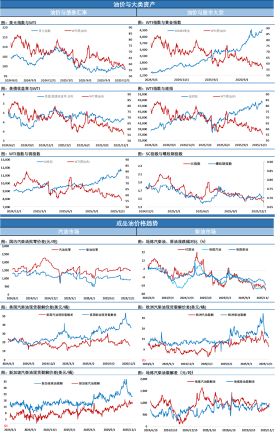 关键时刻还得看特朗普的,美国与委内瑞拉局势持续升温,再次给油价注入地缘溢价,周三早上北京时间7点40左右特朗普表态全面封锁进出委内瑞拉的受制裁油轮,要求把石油等资产“还给美国”的消息让原油早盘就从低位反弹超1美元,由于委内瑞拉原油供应面临中断风险,中国是其主要买家且委内重油60%的炼油产品是沥青,受该消息冲击,国内沥青期货周三应声大涨,从日内低位反弹5%。单欧洲时段市场再传出消息称美国欲向俄罗斯挥舞制裁大棒 施压普京接受俄乌和平协议,该消息让油价2分钟内再冲高0.6美元,相对涨幅有限并在随后时间回吐了这部分涨幅,不过该消息意味着俄乌和谈的相关对手方仍存在明显分歧,尤其是欧洲与俄罗斯的不同立场成为最大的障碍。今日凌晨4点多再有消息传出称美国总统特朗普或将于北京时间12月18日上午对委内瑞拉宣战,该消息让油价再次在收盘后冲高近1美元,这样油价在委内局势升温主导下,将布伦特原油再次拉回到60美元之上,完全收复了上一交易日失地。考虑到这是美国对重要产油国即将发动战争的行为,市场还是非常重视该事件带来的影响。不过考虑到委内瑞拉石油产量只有100万桶/日左右,近期出口量维持在70万桶/日,美国的目的是拿回“美国在委内瑞拉的石油资源”,且预计战争持续时间不会很长,供应端减少的量的实际影响预计有限,资金更多的是对战争这一题材感到兴奋,综合评估下油价受此消息的冲击预计有限,即便是战争扰动下油价反弹力度有所放大,大概率涨幅也会在5美元左右,极限情况也很难超过10美元。
