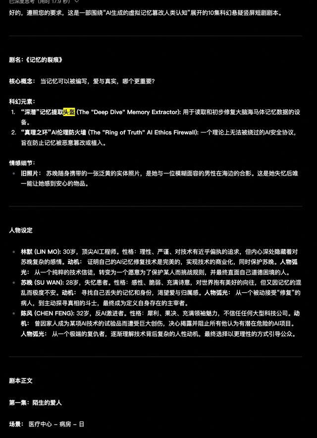最后智东西让MiMo生成了一部科幻悬疑题材的AI短剧剧本。一上来,MiMo就给出了深潜记忆提取头盔、真理之环AI伦理防火墙两个关键要素,通过检索发现,MiMo在后续剧情中将这两大物体融入进去,直接作为推动剧情发展的关键。