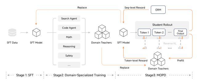 在后训练阶段,为高效拓展强化学习的计算规模,同时增强模型的推理能力与智能体自主决策能力,研究人员提出了多教师在线策略蒸馏(MOPD)。