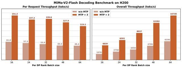 MiMo-V2-Flash利用MTP作为原生草稿模型进行自我推测解码,实现了实际部署加速。