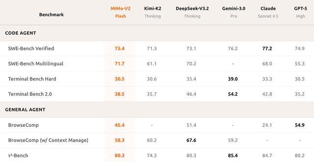 在搜索Agent评估方面,MiMo-V2-Flash在BrowseComp上得分为45.4,配合上下文管理进一步提升至58.3。