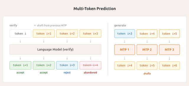 研究人员重新定义了并行解码,以实现极高的输出token吞吐量:通过引入多词元预测(MTP)训练,提升了基础模型的能力,并在推理过程中并行验证了MTP。