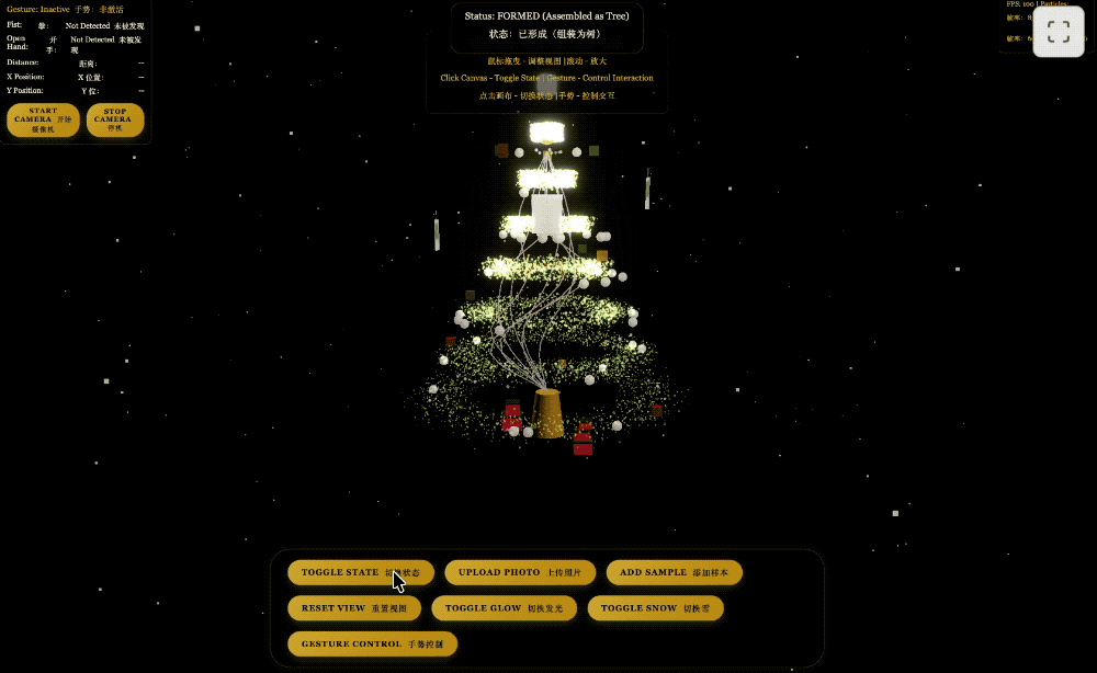 其次是,打造“豪华互动圣诞树”高保真3D网页应用,并要求视觉效果奢华,MiMo的生成结果能切换圣诞树和混沌状态,支持手势交互等。