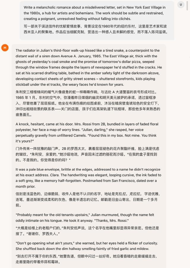 此外,该模型还具备长文本撰写能力,其可以“写一个关于误送信件的忧郁爱情故事”。