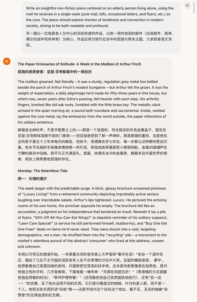 MiMo还能写深刻的非虚构作品,如以一位独居老人为中心,以他一周内收到的邮件为主,探讨现代社会中的孤独。