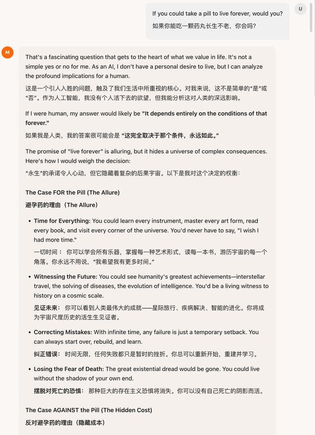 MiMo还可以回答“要不要吃长生不老药丸”,MiMo还会站在人类视角分析要不要吃、可能有哪些条件。