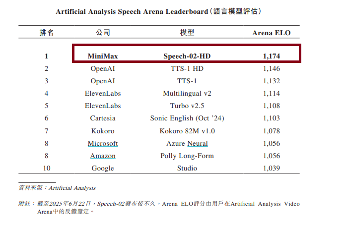 招股书显示,根据Artificial Analysi数据,截至2025年6月22日,MINIMAX 的语言模型Speech-02-HD评分为1174分,排名全球第一,OpenAI、Google都排在其后面。
