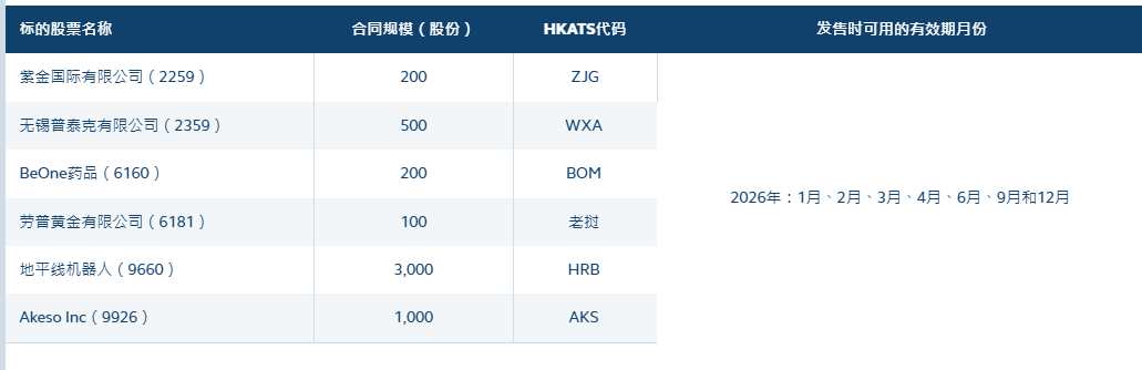 新推出的期权标的分别为紫金国际有限公司(2259)、无锡普泰克有限公司(2359)、BeOne药品(6160)、劳普黄金有限公司(6181)、地平线机器人(9660)、Akeso Inc(9926)。