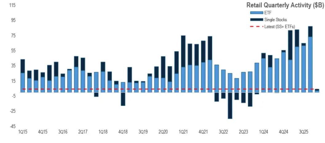 这波新一轮股票买入浪潮跟随了2025年散户型投资者们的无比辉煌表现。根据摩根大通的统计数据,2025年全年度的散户资金流入几乎是过去五年平均水平的足足两倍,相比2021年创下的前历史纪录高出17%,并比2024年更是大幅增长了近60%。仅在12月单月,散户们股票买入热潮就创下了自“4月初期解放日逢低买入狂热”以来的最大月度股票买入量。