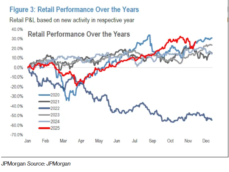 根据来自摩根大通证券业务部门(JPMorgan Securities)的资深分析师Arun Jain表示,散户交易者们在2025年创下历史纪录性的交易额以及投资收益表现后,已将“逢低买入”热潮延续到新的一年。