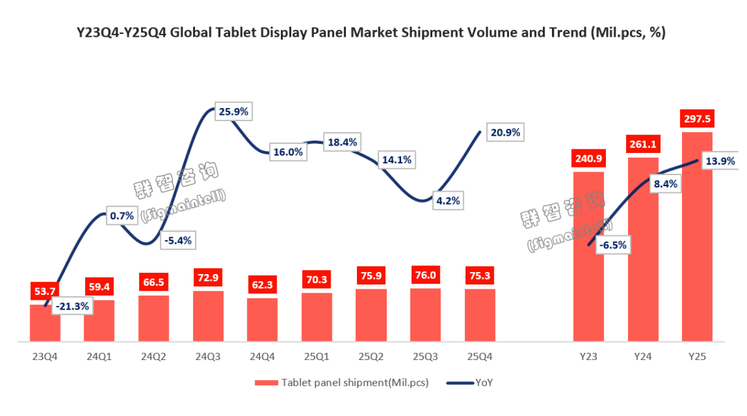 根据群智咨询数据,2025年第四季度,全球平板面板出货量约为7530万片,同比增长约20.9%,环比下滑约0.9%。回看全年,全球平板面板总出货近3.0亿片,同比增长约13.9%,高于2024年的8.4%。这一增长由“技术升级 + 场景拓展 + 政策驱动”三重力量共同塑造。