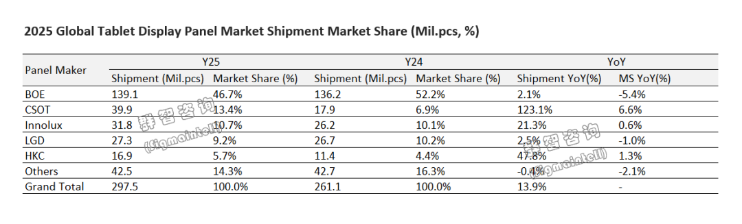 根据群智咨询数据,京东方(BOE)以约1.4亿片出货量、46.7%市占率稳居龙头,技术覆盖a-Si/LTPS/Oxide/OLED,客户遍及全球主流品牌,展现出典型的“平台型厂商”特征;TCL华星(CSOT)出货同比激增123.1%,出货近4000万片,依托品牌客户需求快速上量;与此同时,台系厂商在整体承压下依托华南白牌及类平板需求实现企稳:群创(Innolux)出货同比增长约21.3%,同时也在维系三星、亚马逊、联想等品牌订单;LG显示(LGD)则依托苹果的稳定订单及 OLED 高端产品布局,持续巩固其在高端平板面板市场的战略地位。惠科(HKC)、天马(Tianma)等大陆新势力亦加速布局,推动中尺寸产能向中国大陆进一步集中。