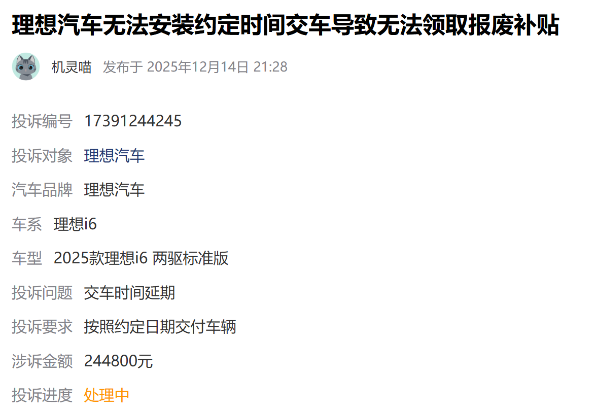 对消费者伤害更大的是,不少消费者在黑猫上投诉,由于理想i6延期交付,他们错过了2025年年底的国家“以旧换新”补贴窗口,造成了难以弥补的实际经济损失。