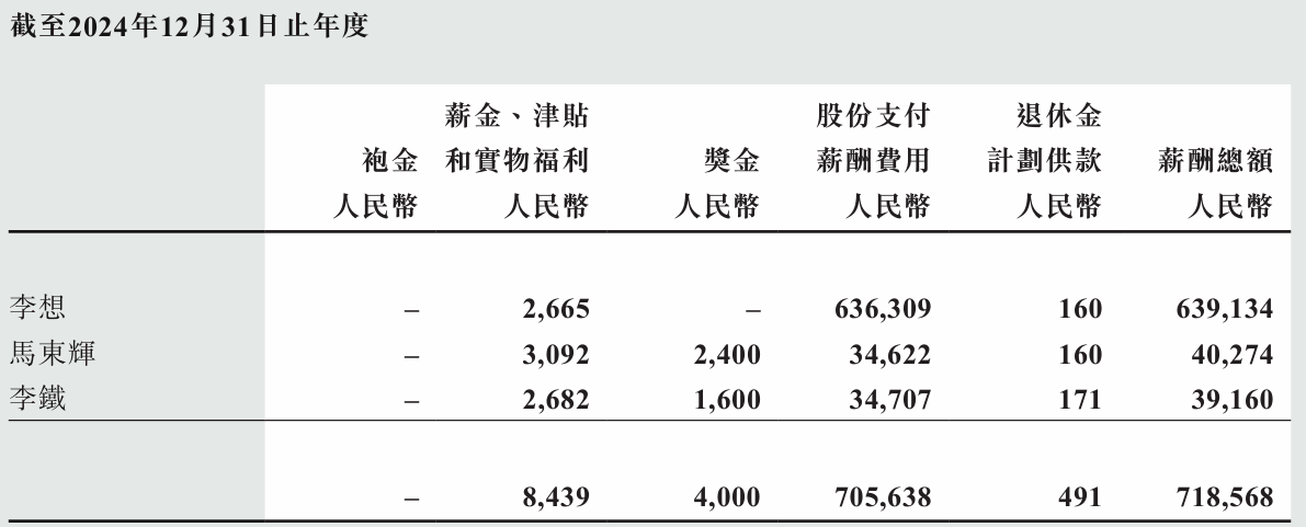专注于描绘AI蓝图工作的李想,其工资也成了受关注的焦点。2024年报显示,李想薪酬总额达6.39亿元。尽管理想汽车方面称,李想2024年的全部实际薪酬为266万元,年销量50万辆对应的1800万股奖励约合6.39亿元费用,属于公司按照美股上市公司必须记账的费用,但也形成了反差——销量上行时,李想勇担重任,成功获得激励;销量承压时,李想避战,马东辉总体“背锅”。