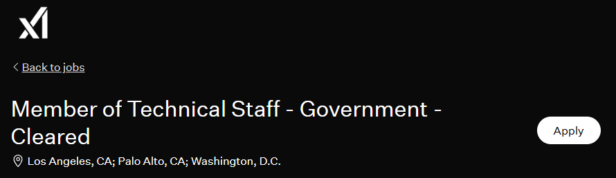 xAI的官方网站显示,公司正招聘具备“机密”或“绝密”安全许可的工程师,主要来自华盛顿或美国西海岸,以与联邦承包商合作。