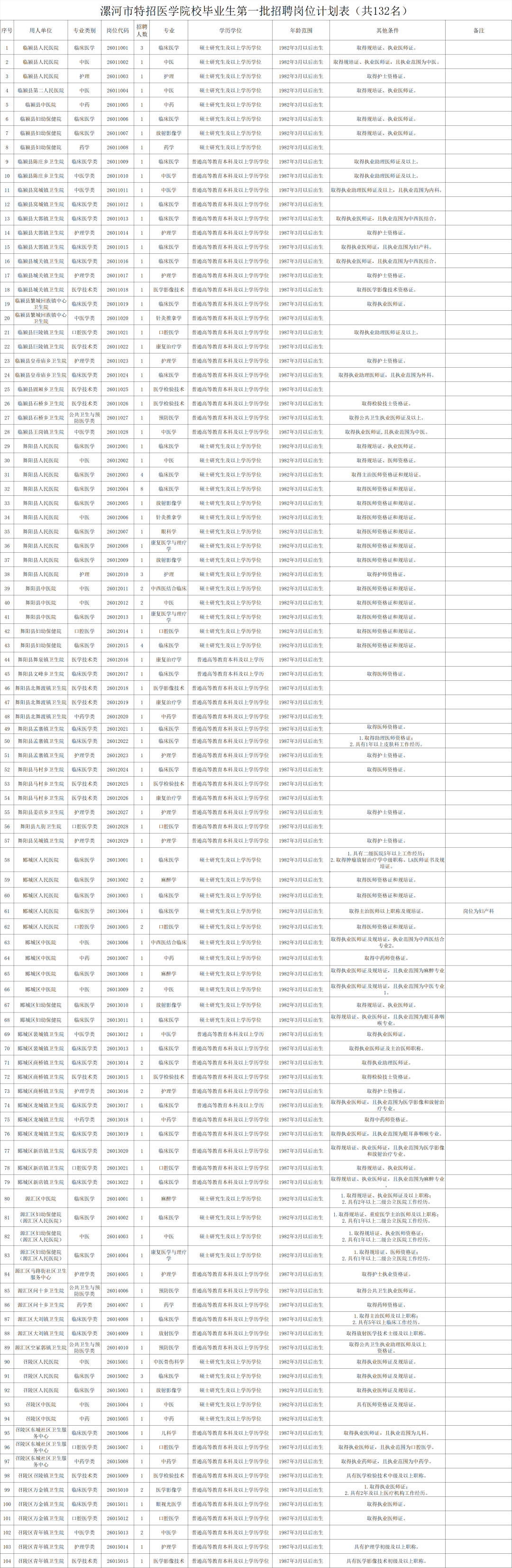 2月28日,漯河市人力资源和社会保障局发布《漯河市特招医学院校毕业生招聘公告》,根据人员编制空缺情况和县区招聘计划需求,全市共招聘医学院校毕业生132名,其中:临颍县30名、舞阳县46名、郾城区27名、源汇区10名、召陵区19名。