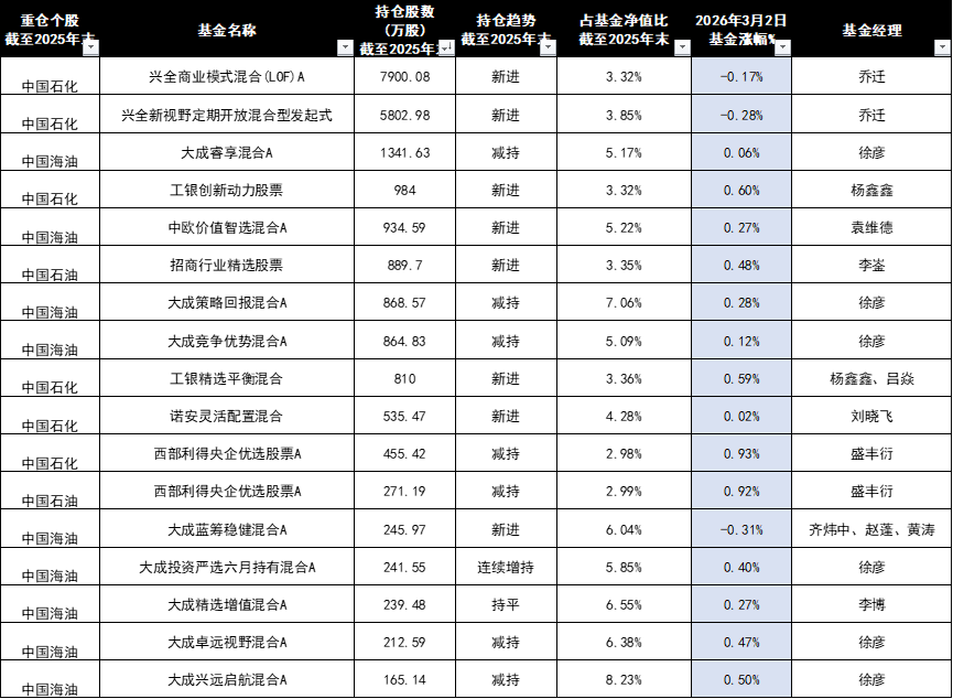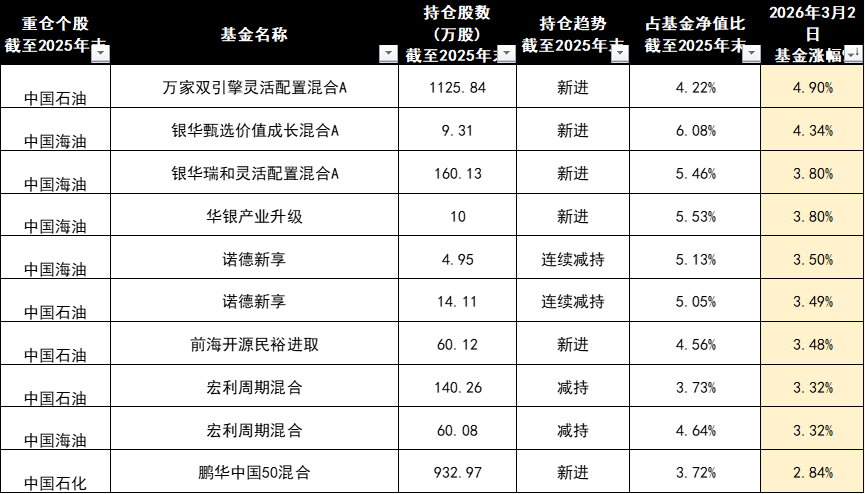 值得注意的是,不少主动基金经理其实早在 2025 年底就已重仓三桶油,但无奈提前卖飞,只能在油价拉升之际拍断大腿。