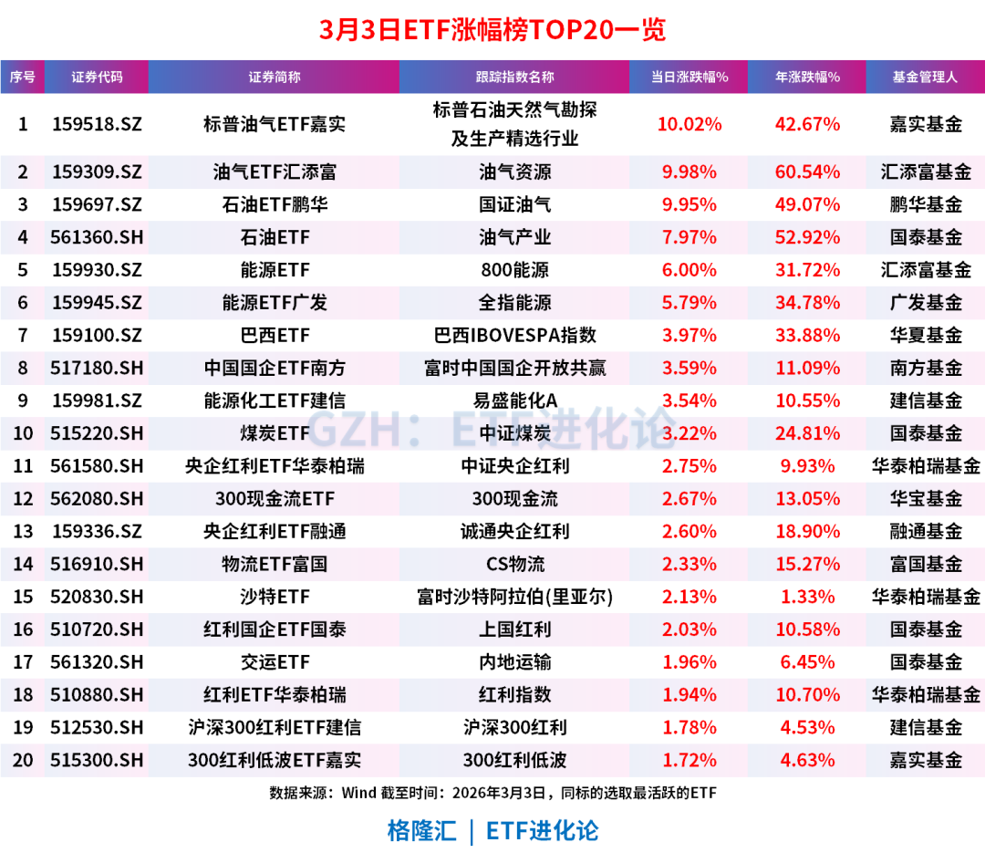 当日ETF资金集中流向资源(石油、黄金、有色金属)、高端制造(电网设备、军工、化工)。