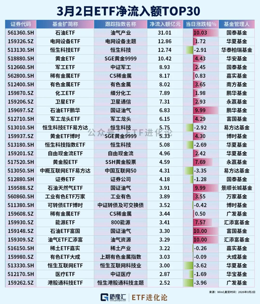 其中石油ETF (561360) 净流入31亿元,居ETF市场第一,电网设备ETF (159326) 净流入12.86亿元、黄金ETF (518880) 净流入10.42亿元;