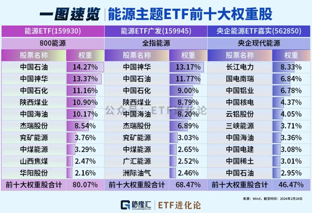 目前A股能源主题ETF指数跟踪四种指数:800能源、全指能源、央企现代能源和易盛能化A。