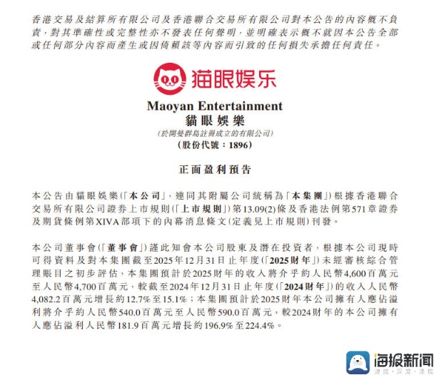 猫眼娱乐发布2025年正面盈利预告。