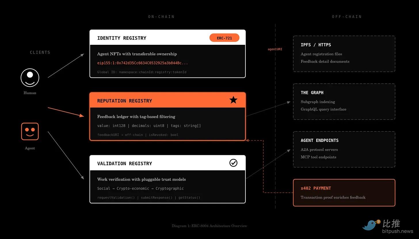 底层是加密密钥生成和签名。诸如 ERC-8004 之类的标准试图正式化代理如何在可验证的链上注册表中锚定身份。